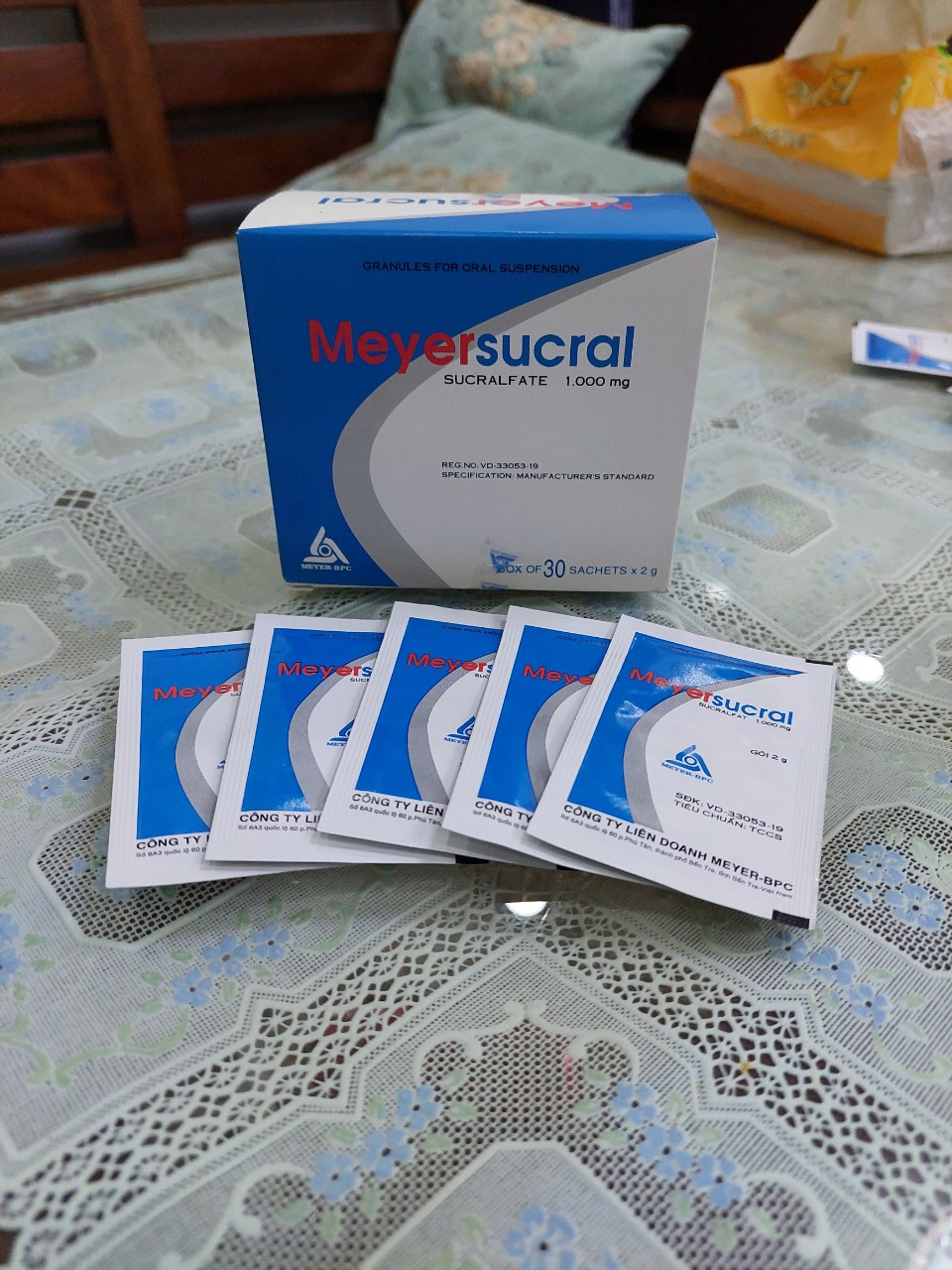 Meyersucral 1000mg là sản phẩm của Công ty liên doanh Meyer-BPC với thành phần chính là Sucralfate. Meyersucral 1000mg được chỉ định điều trị ngắn ngày loét tá tràng, loét dạ dày lành tính, viêm dạ dày mạn tính.